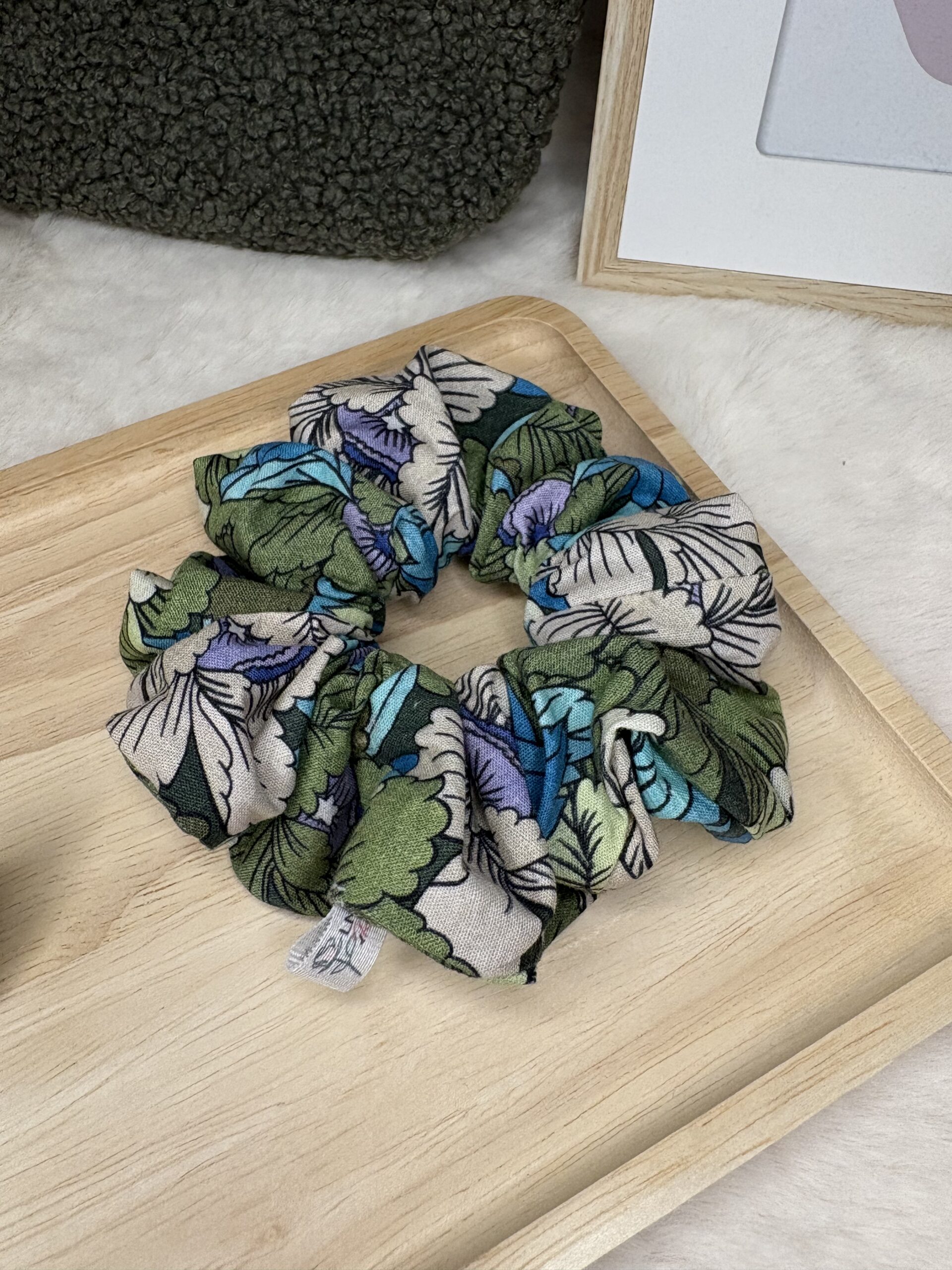 Le chouchou en bouclettes kaki est l’accessoire idéal pour allier praticité et élégance.